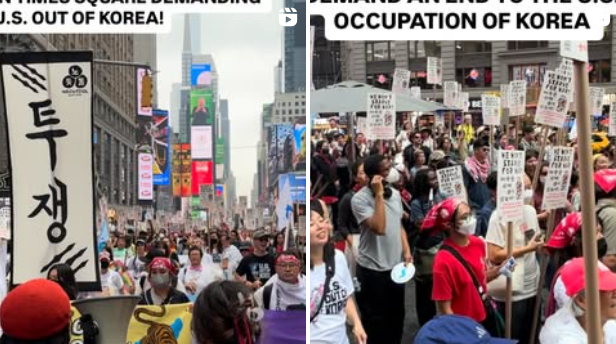 함재규 전국민주노동조합총연맹(민노총) 부위원장이 지난 27일(현지시각) 뉴욕 타임스퀘어에서 연설하고 있다. ⓒ유튜브 캡처